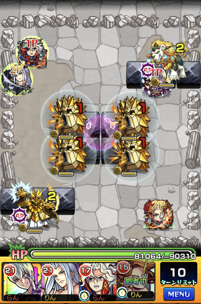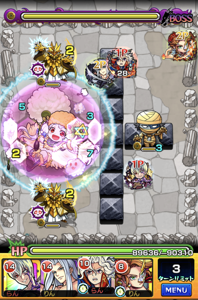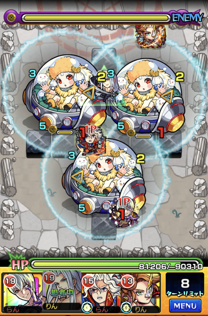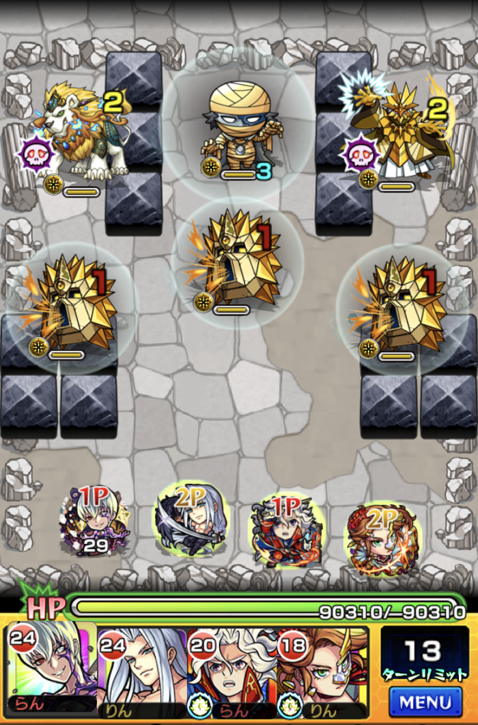 最終ステージ。初手でプロテクトバリアと上下どっちかの魔道師を倒しておきたい。最低でも残ターン数は3ターンは欲しいかなって。